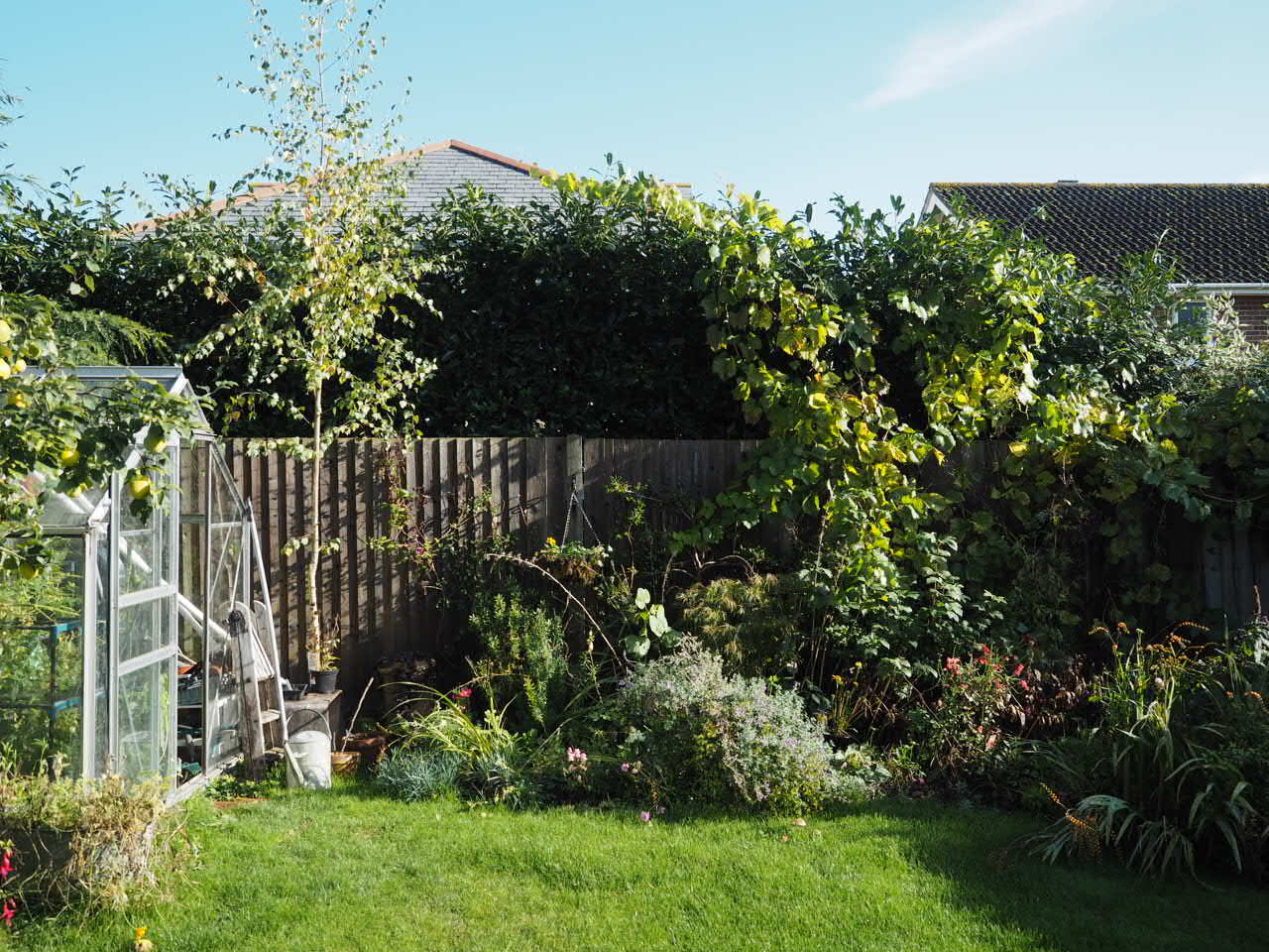 Late summer, with most of the flowers over and lush greenery remaining